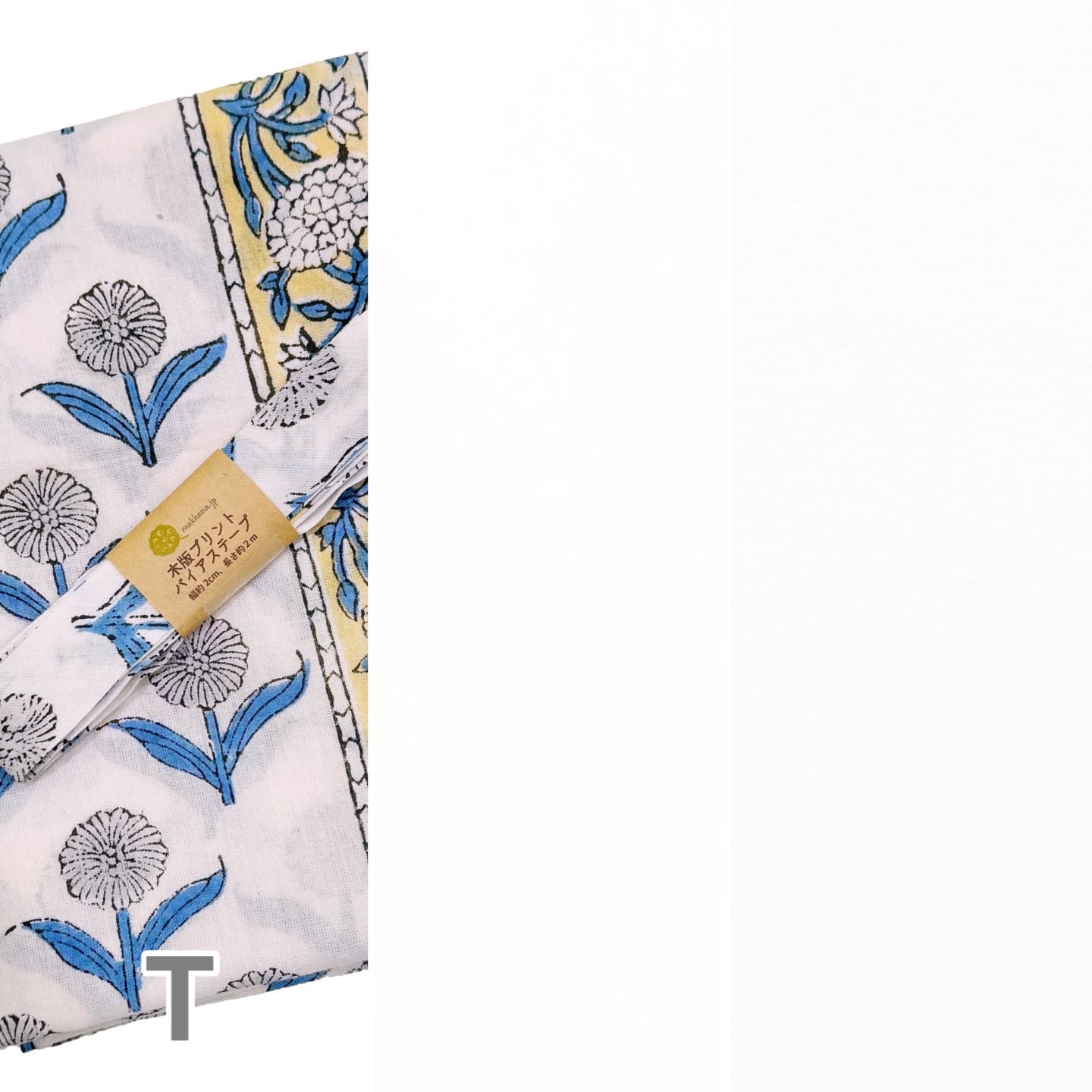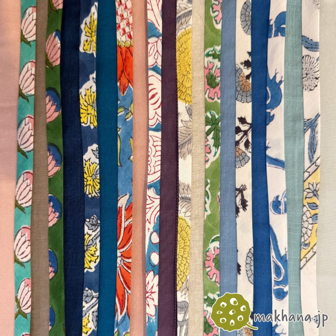 木製の型を手で押し当てながら色柄を重ねていくインドの伝統的なプリント生地で作ったバイアステープです
