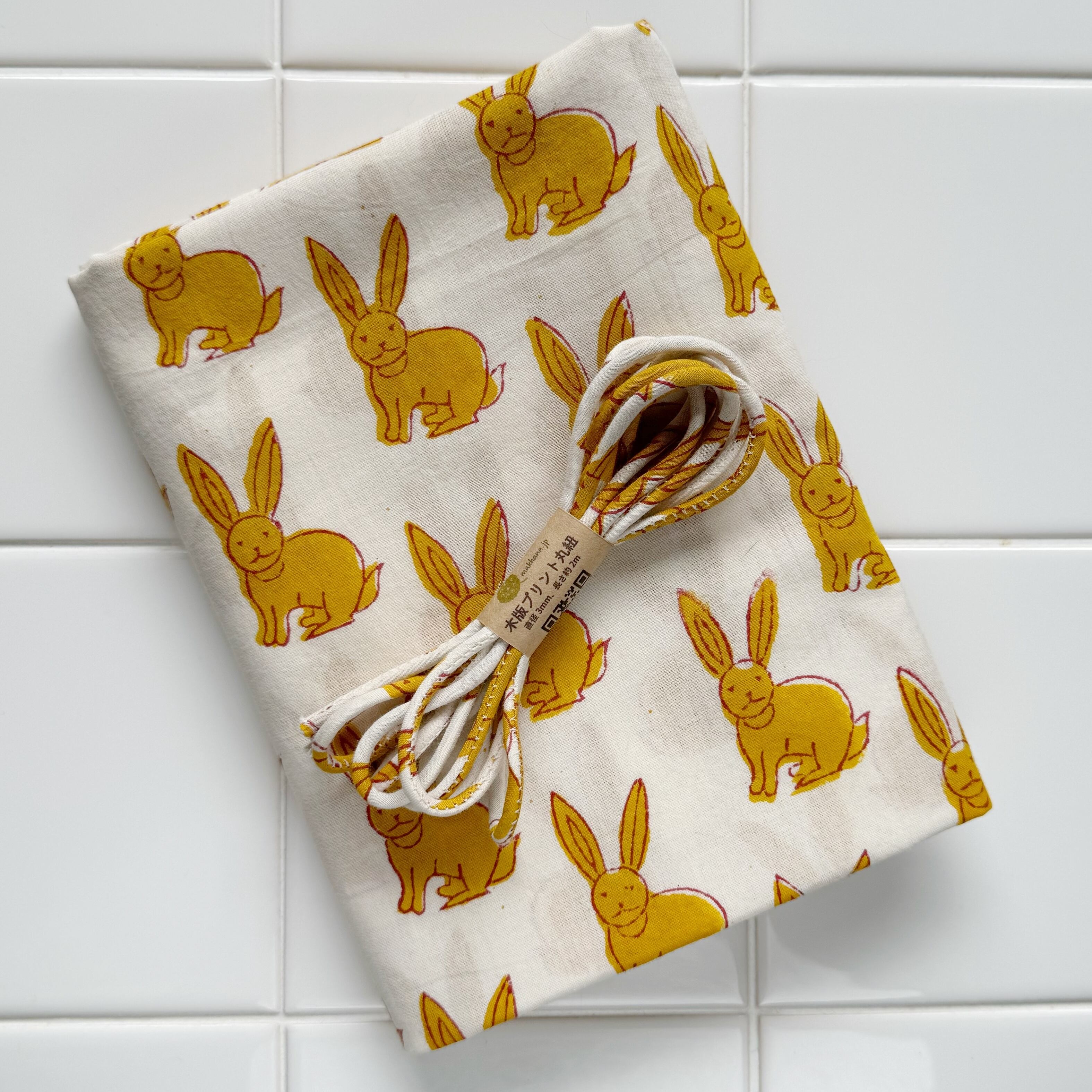 木製の型を手で押し当てながら色柄を重ねていくインドの伝統的なプリント生地で作った丸紐です