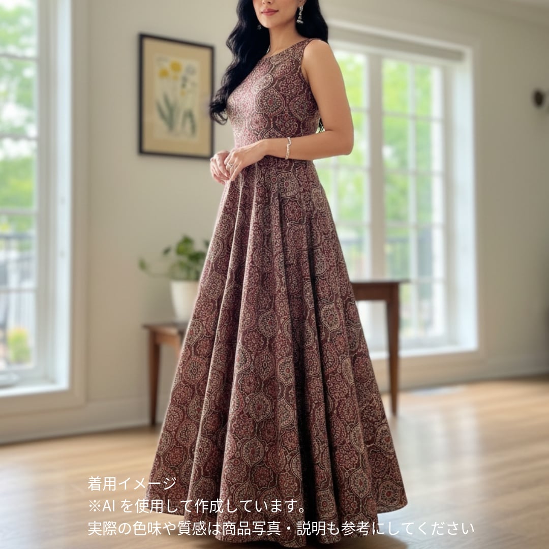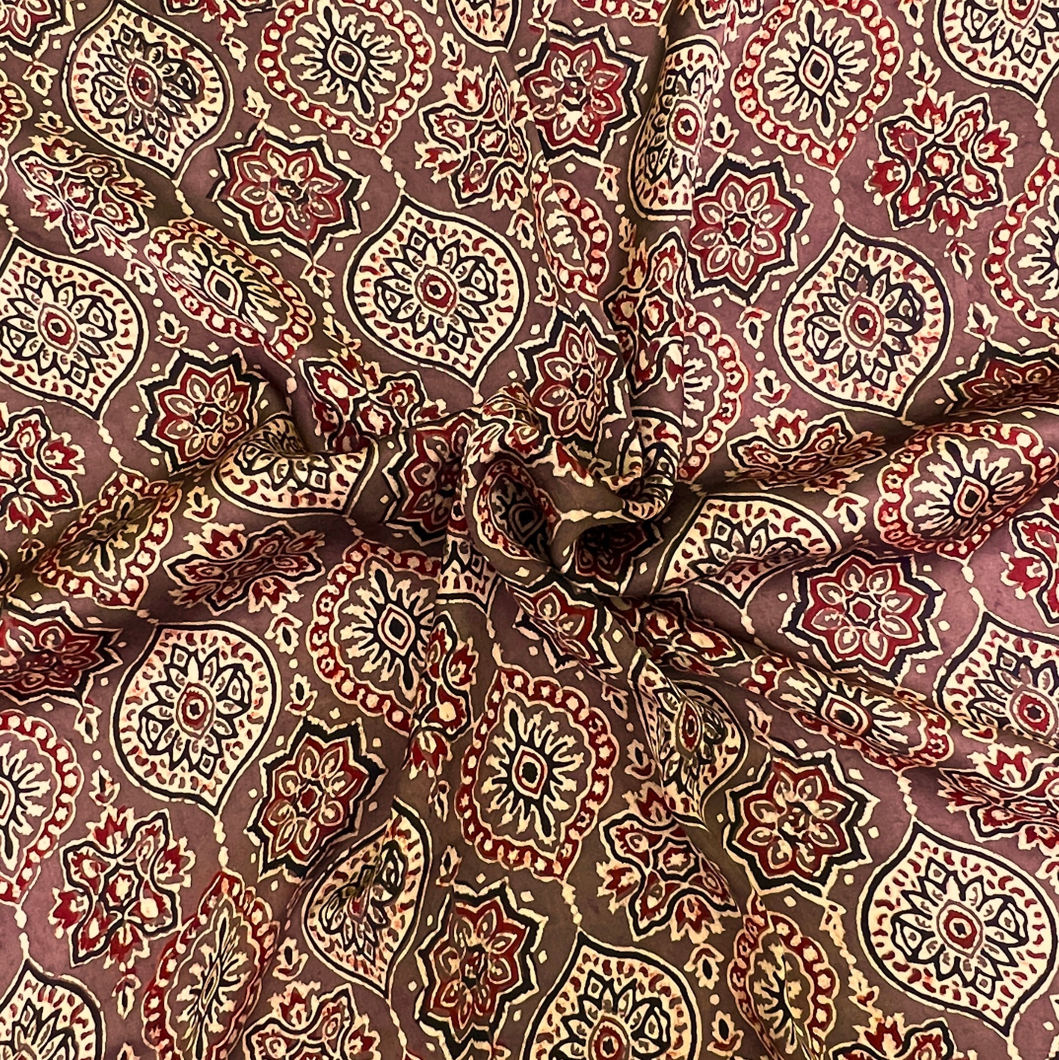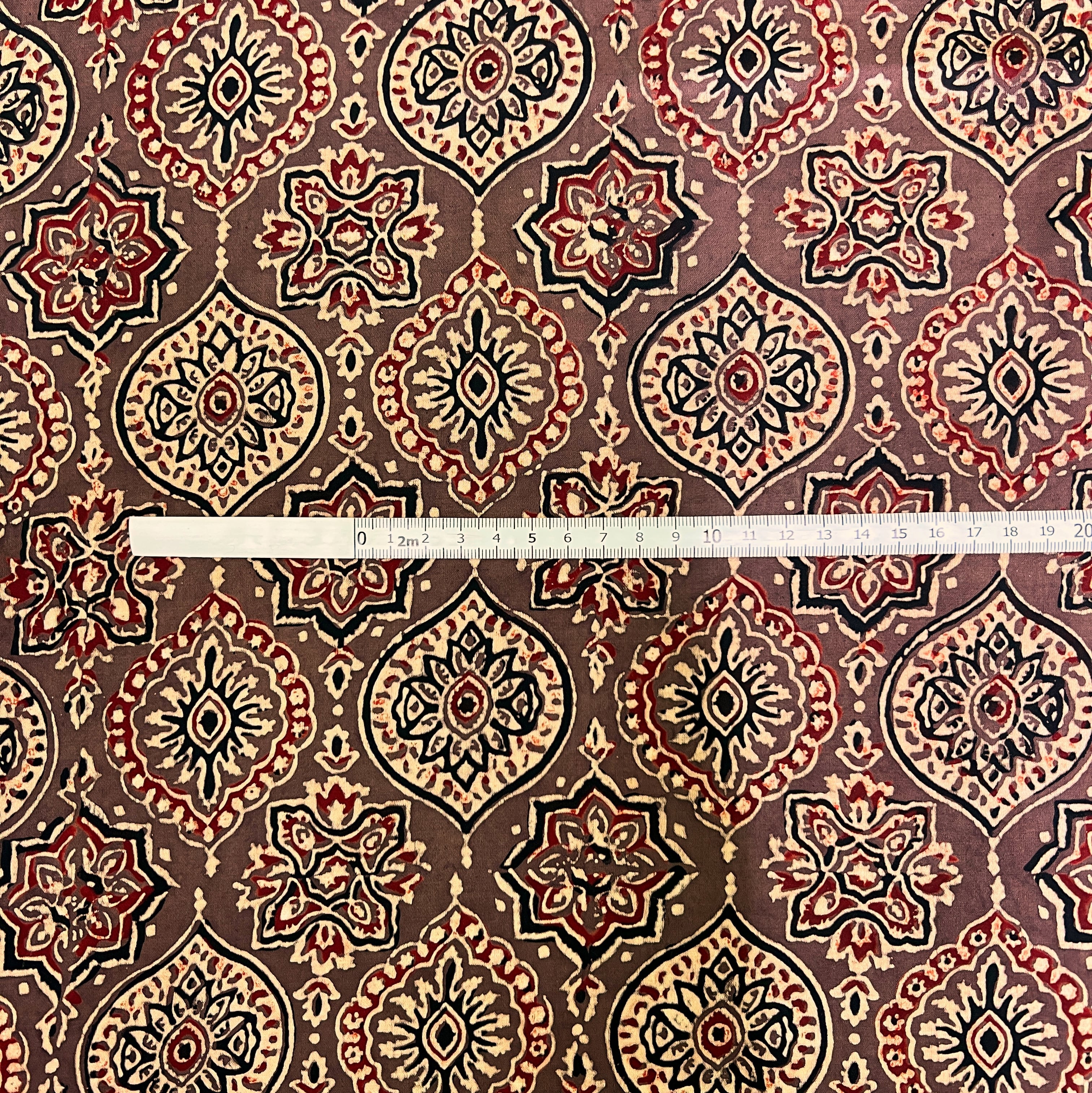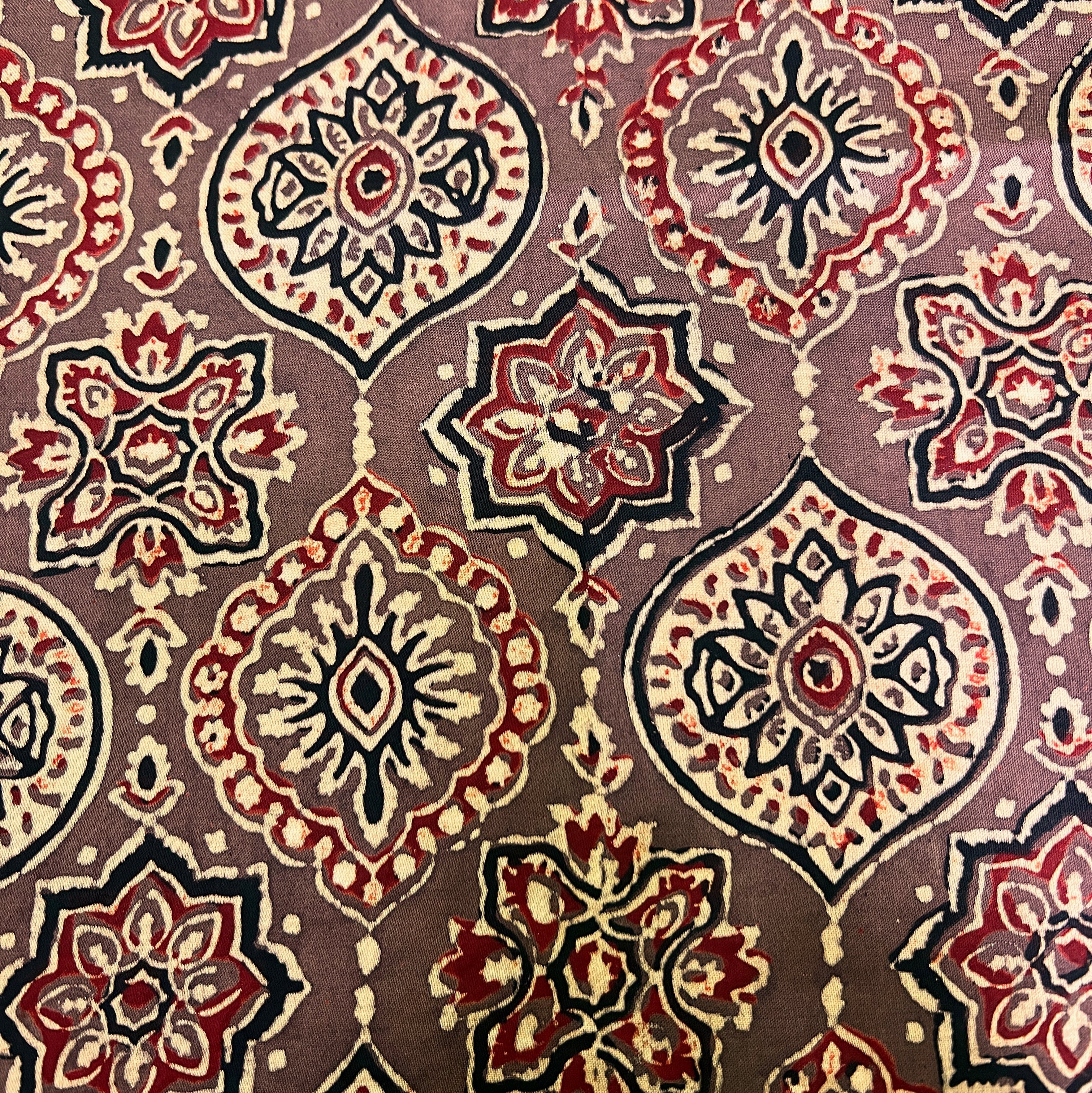 抜染した生地に木製の型を手で押し当てながら色柄を重ねていくインドの伝統的なAjrakh(アジュラク)ブロックプリント生地です。