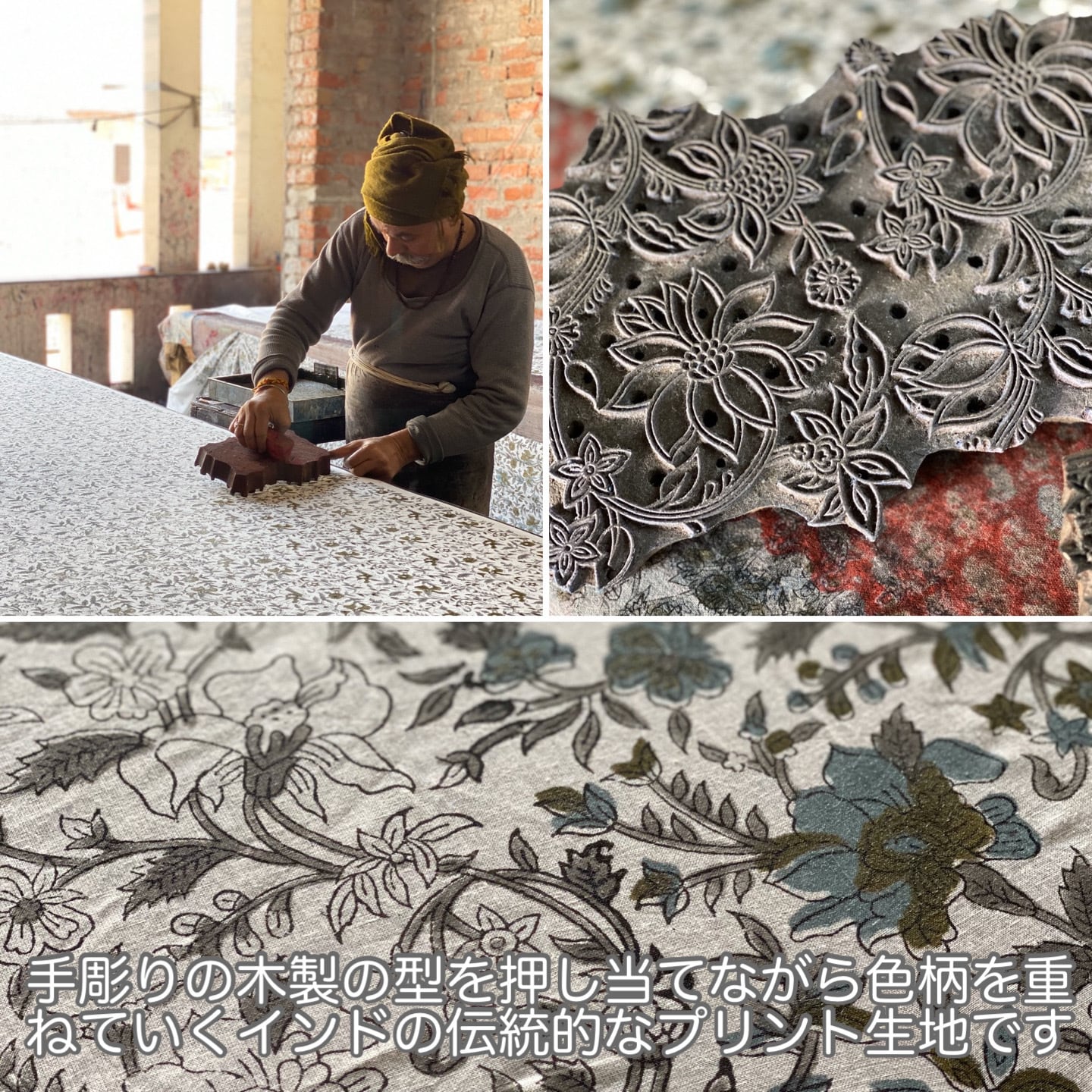 1枚1枚職人さんの手作業でプリントされているので、同じ色柄でも染料の配合や木版の押し方などで商品画像または一度お買い上げになった生地の見た目と雰囲気が変わっていることがあります。