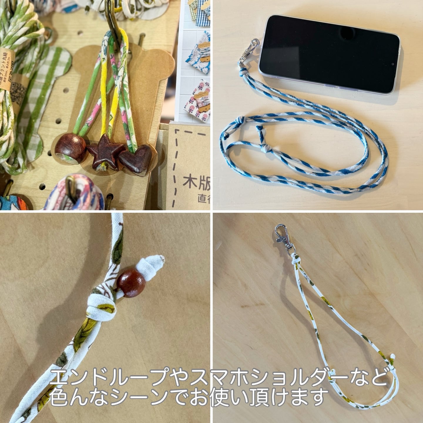 木製の型を手で押し当てながら色柄を重ねていくインドの伝統的なプリント生地で作った丸紐です